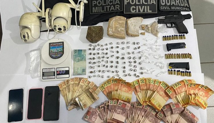 No endereço alvo, situado no bairro Barra, as equipes policiais apreenderam uma grande de maconha e crack; uma pistola calibre .9mm; 32 munições; um colete balístico; uma balança de precisão, dinheiro e anotações referentes a contabilidade da grande comercialização de drogas do local.